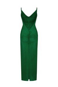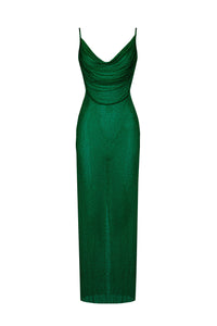 The Crystal Gown is a breathtaking piece designed for maximum impact. Fully encrusted with shimmering crystals, it sculpts the body in a flawless, figure-enhancing silhouette, while the daring open back adds a touch of modern sensuality. The deep Emerald tone intensifies the drama, making the gown fall gracefully to the floor with timeless glamour and a contemporary edge.