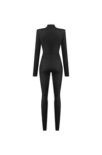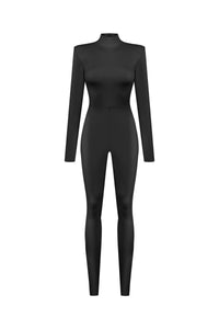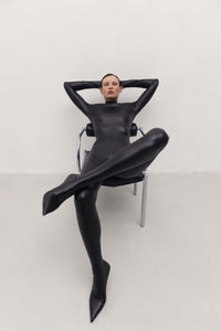 Step into the spotlight with our iconic black full-length jumpsuit. This sleek, turtleneck design offers full-body coverage and sophistication, hugging your curves with our signature 4D stretch vegan leather. Make a striking entrance and celebrate your individuality with this timeless statement piece.