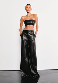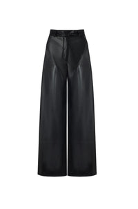 Exude confidence with these black vegan leather wide leg pants, designed for the modern muse. Cut from buttery vegan leather, they sit low on the waist and cascade into a dramatic, flowing silhouette. The perfect blend of structure and fluidity, these trousers make a statement whether paired with the matching Hourglass Blazer or styled with a simple tank for a more casual yet refined ensemble.